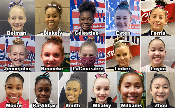 - Excalibur Cup, Virginia Beach, Va.: Hannah Loyim, Mountain Lakes, N.J./North Stars Gymnastics Academy, senior; Jocelyn Moore, Hillsborough, N.J./Gymland/Arena Gymnastics, senior; Azaraya Ra-Akbar, Columbia, Md./World Class Gymnastics, junior; and Ruth Whaley, Annapolis, Md./Win-Win Gymnastics, junior